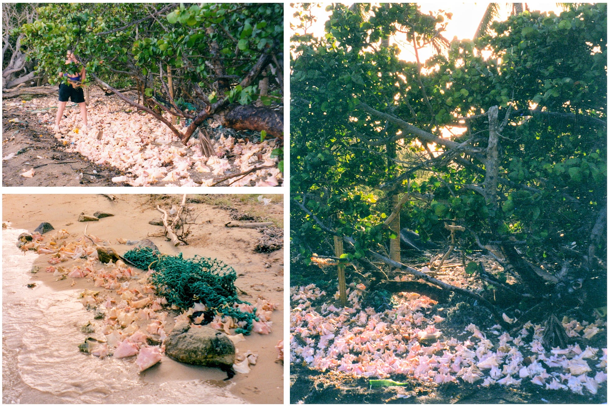 We made our way around the southeast end of the island to a beautiful bay, fringed with palm trees and sea grape bushes, accessed through a small opening in the reef. Once inside and anchored up, we found it was a place where conch fishermen came to clean their catch, and the entire beach was piled high with gorgeous pearlescent pink conch shells.
